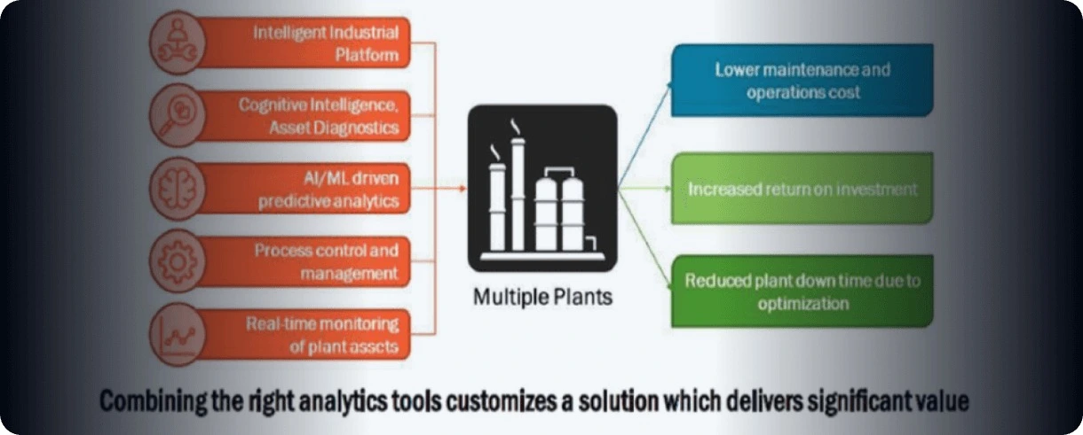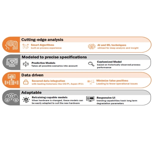 These solutions help manufacturing units operate more efficiently, maximize their capacities and production rates, lower maintenance and operating cost, reduce plant down times, improve safety and sustainability metrics and increase ROI (i.e.Return On Investment). These solutions can be applied at a single unit or across multiple plants and provide an overview of equipment health.